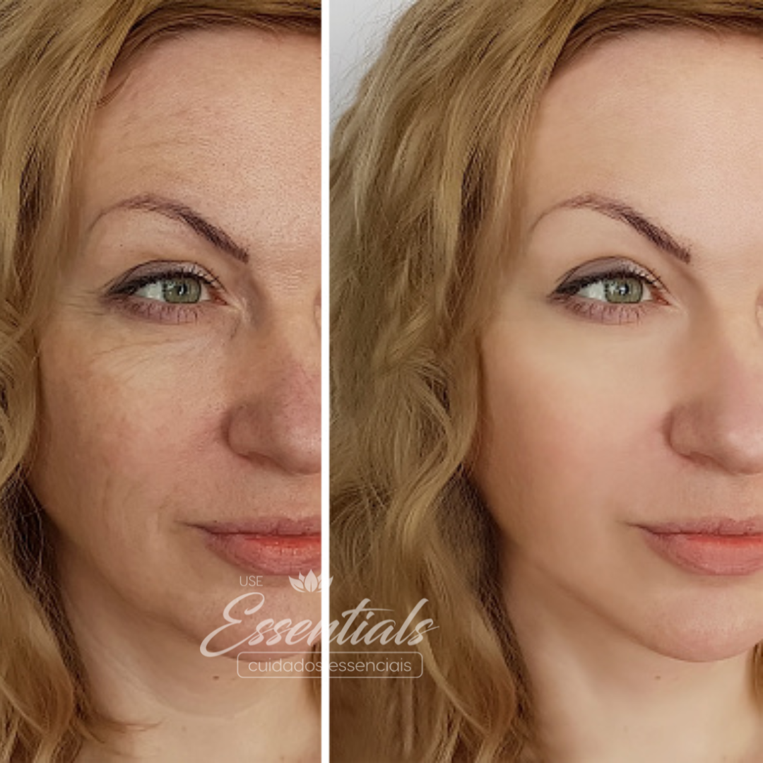 Diferente dos cremes comuns, o Sérum Essentials cria um efeito lifting imediato que suaviza linhas finas e rugas logo nas primeiras aplicações. Sua fórmula com Rosa Mosqueta + Ácido Hialurônico age nas camadas mais profundas da pele, devolvendo firmeza e preenchendo marcas de expressão de dentro para fora. O resultado é um rosto mais liso, uniforme e com aparência descansada, já nos primeiros dias de uso.