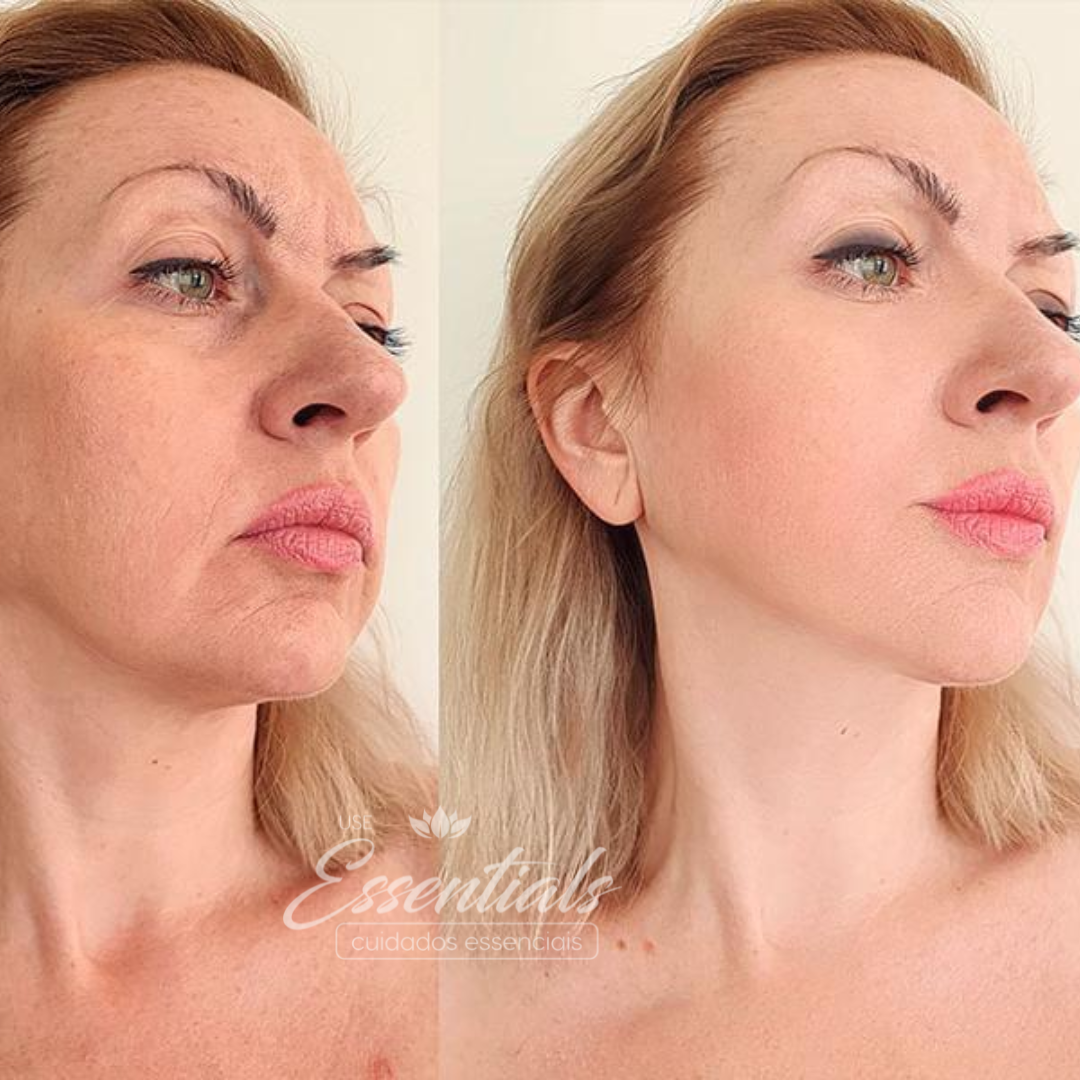 O sistema Essent-Restore® combina três potentes ativos, Rosa Mosqueta, Ácido Hialurônico e Colágeno Verisol®, em uma tecnologia 3D que preenche a pele de dentro para fora. Essa ação reduz a profundidade das rugas e suaviza o famoso “bigode chinês”, deixando o contorno facial mais firme e uniforme. Com o uso contínuo, a textura da pele fica mais lisa e o rosto ganha um aspecto naturalmente rejuvenescido.